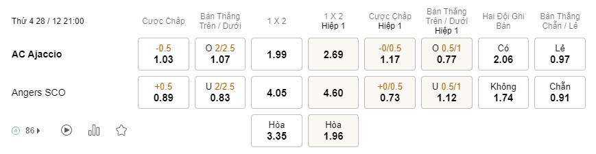 Soi kèo hiệp 1 Ajaccio vs Angers: 1.17*0/0.5*0.73