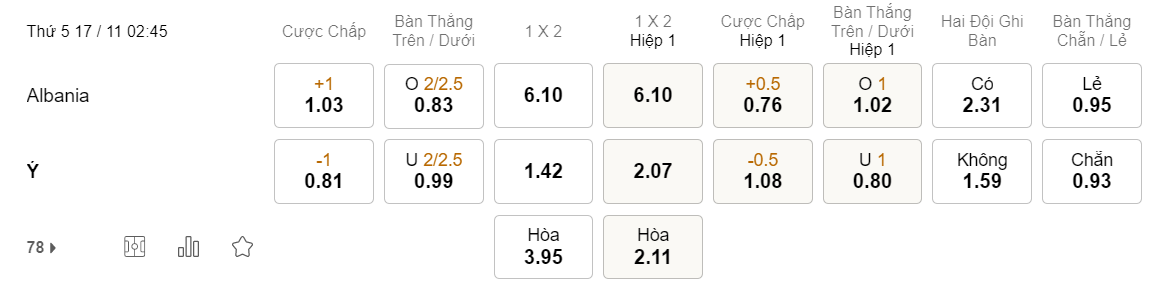 Soi kèo hiệp 1 Albania vs Ý: 0.76*0.5*1.08