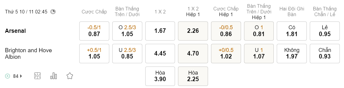 Tỉ lệ kèo Arsenal vs Brighton