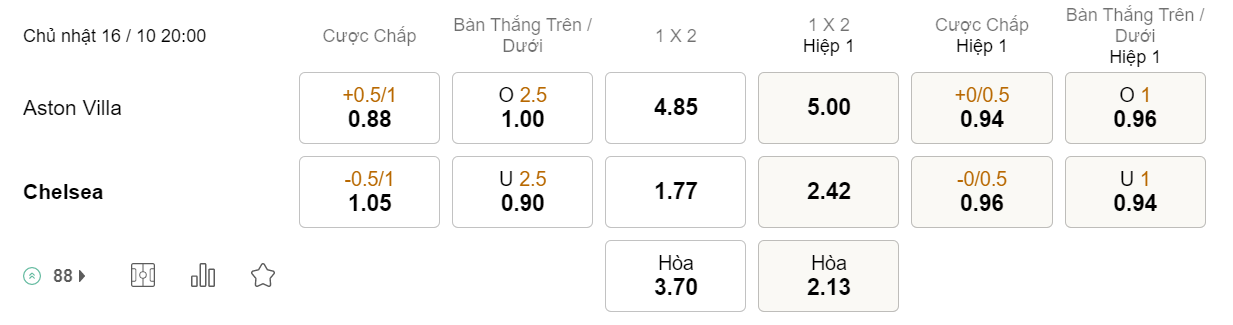 Soi kèo châu Á Aston Villa vs Chelsea: 0.88*0.5/1*1.05