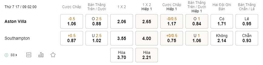 Soi kèo tài xỉu Aston Villa vs Southampton: 0.88*2.5*1.02