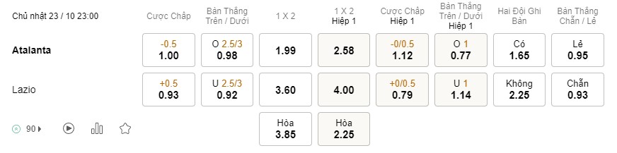 Soi kèo hiệp 1 Atalanta vs Lazio: 1.12*0/0.5*0.79