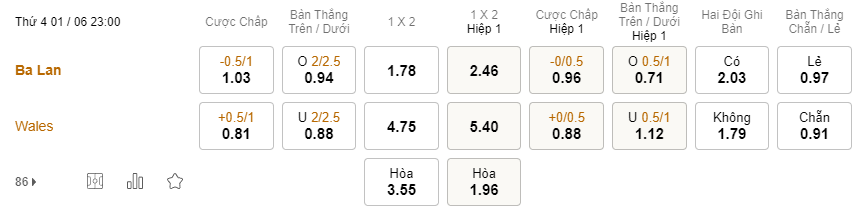 Soi kèo hiệp 1 Ba Lan vs Wales: 0.96*0/0.5*0.88