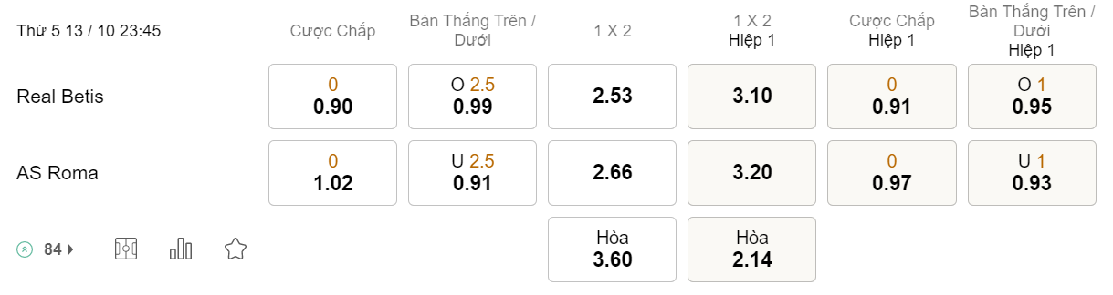 Soi kèo hiệp 1 Betis vs Roma: 0.91*0*0.97