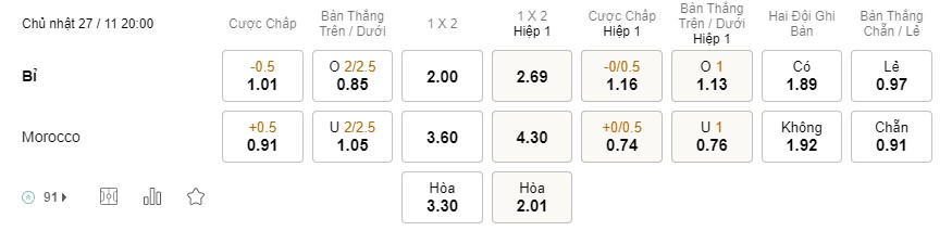 Soi kèo châu Á Bỉ vs Morocco: 1.01*0.5*0.91
