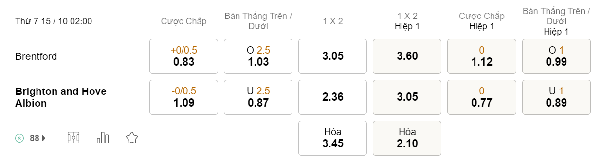 Soi kèo hiệp 1 Brentford vs Brighton: 1.12*0*0.77