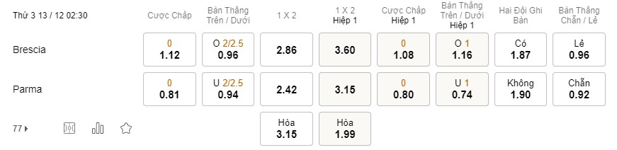 Soi kèo châu Á Brescia vs Parma: 1.12*0*0.81