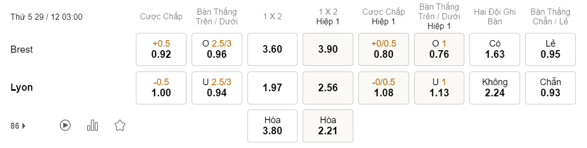 Soi kèo hiệp 1 Brest vs Lyon: 0.80*0/0.5*1.08
