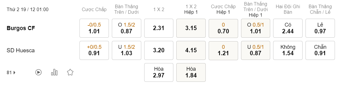 Soi kèo châu Á Burgos vs Huesca: 1.01*0/0.5*0.91