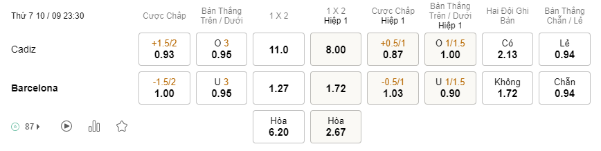 Soi kèo hiệp 1 Cadiz vs Barcelona: 0.87*0.5/1*1.03