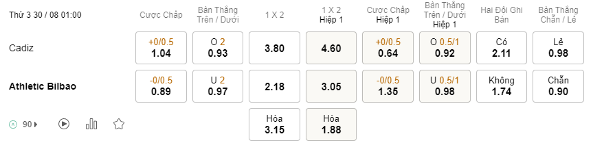 Tỉ lệ kèo Cadiz vs Bilbao