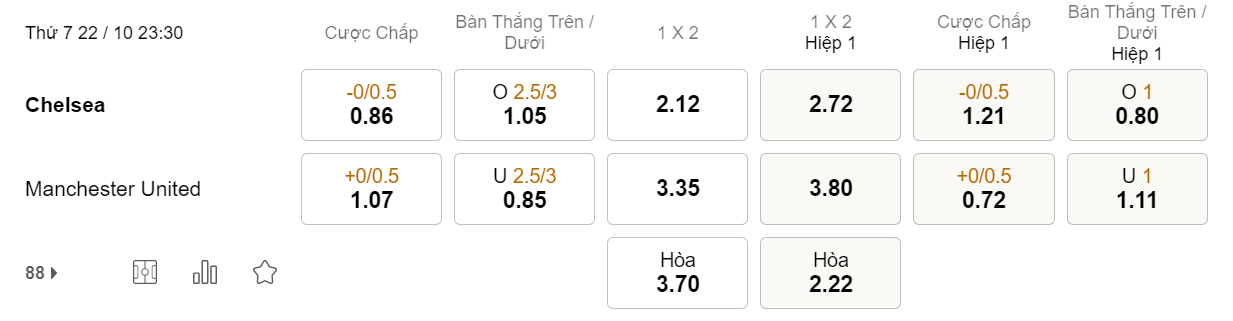 Soi kèo hiệp 1 Chelsea vs MU: 1.21*0/0.5*0.72