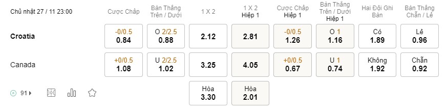 Soi kèo hiệp 1 Croatia vs Canada: 1.26*0/0.5*0.67