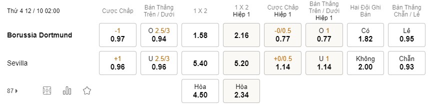 Tỉ lệ kèo Dortmund vs Sevilla