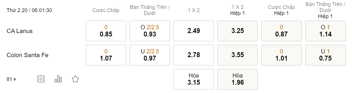 Soi kèo tài xỉu Lanus vs Colon: 0.93*2/2.5*0.97