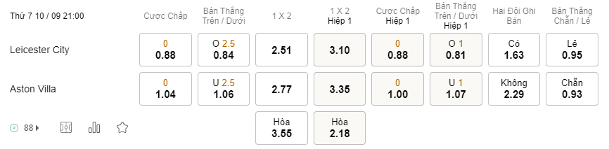 Soi kèo hiệp 1 Leicester vs Aston Villa: 0.88*0*1.00
