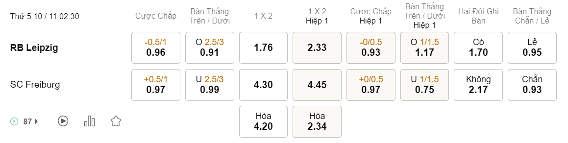 Cũng theo thống kê lịch sử đối đầu giữa hai đội, 6 lần gần nhất gặp nhau, NHM của Leipzig và Freiburg đều đã được chứng kiến bàn thắng tới ngay trong hiệp 1. Vì vậy các chuyên gia cho rằng, khả năng cao 45 phút đầu tiên của trận đấu này sẽ khép lại với ít nhất 1 bàn thắng cho đội chủ nhà.
