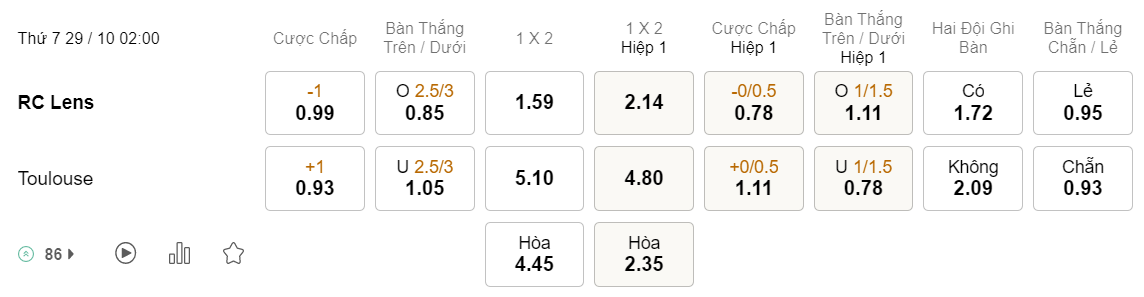 Soi kèo châu Á Lens vs Toulouse: 0.99*1*0.93