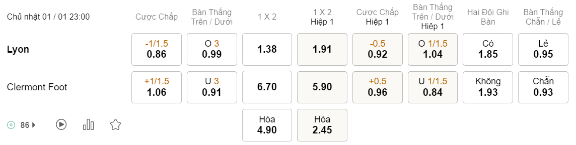 Tỉ lệ kèo Lyon vs Clermont