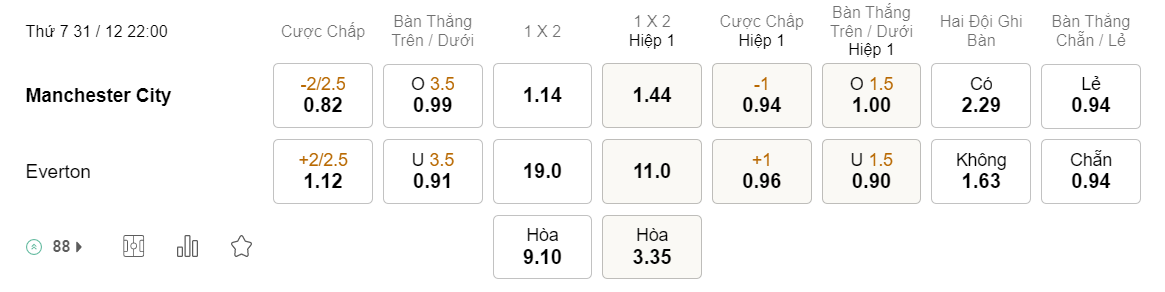 Soi kèo tài xỉu Man City vs Everton: 0.99*3.5*0.91