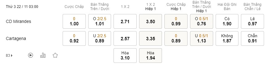 Tỉ lệ kèo Mirandes vs Cartagena