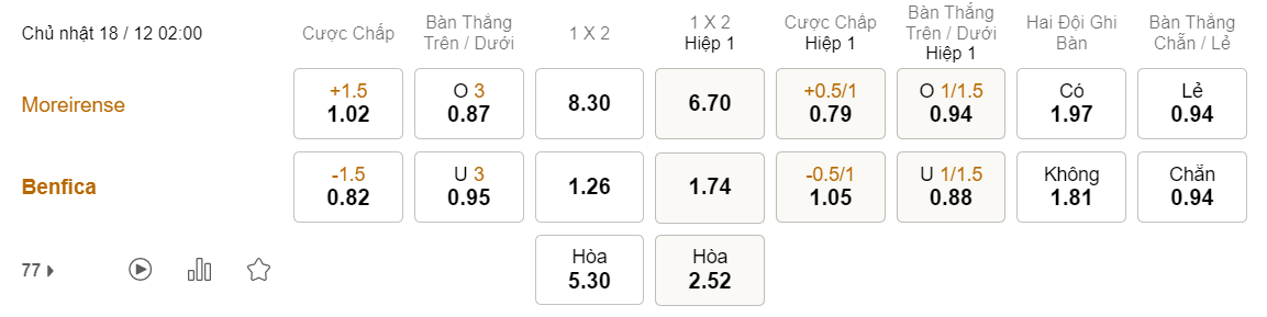 Soi kèo châu Á Moreirense vs Benfica: 1.02*1.5*0.82