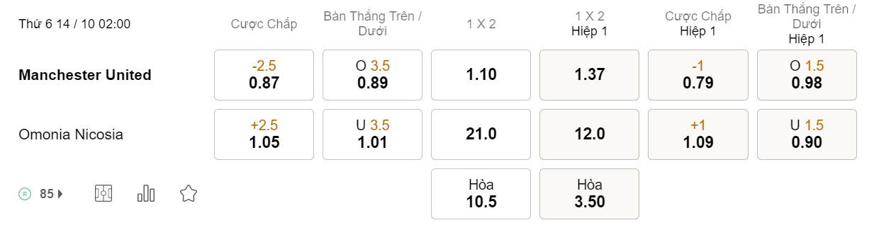 Soi kèo châu Á MU vs Omonia Nicosia: 0.87*2.5*1.05