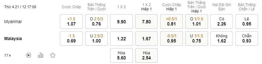 Soi kèo châu Á Myanmar vs Malaysia: 1.07*1.5*0.69