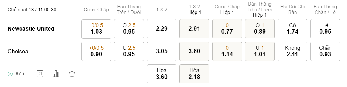 Soi kèo châu Á Newcastle vs Chelsea: 1.03*0/0.5*0.90