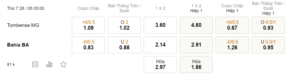 Soi kèo hiệp 1 Tombense vs Bahia: 0.67*0.0.5*1.26