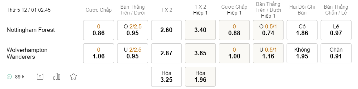Tỉ lệ kèo Nottingham vs Wolves