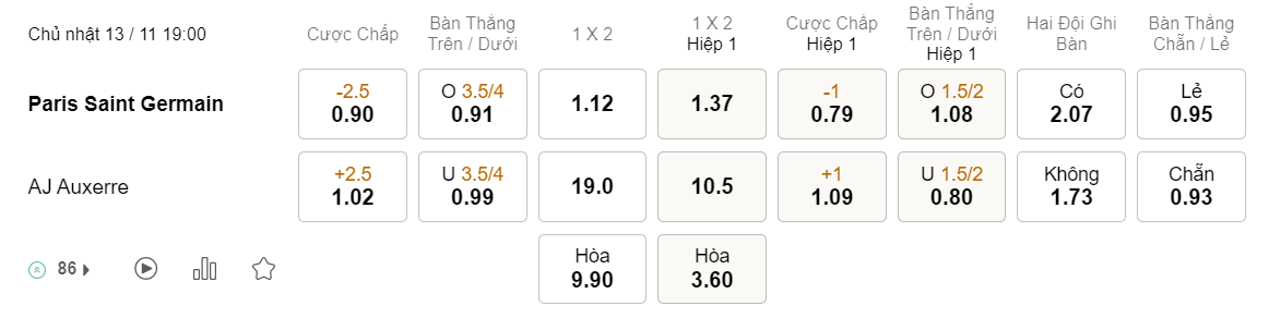 Soi kèo hiệp 1 PSG vs Auxerre: 0.79*1*1.09