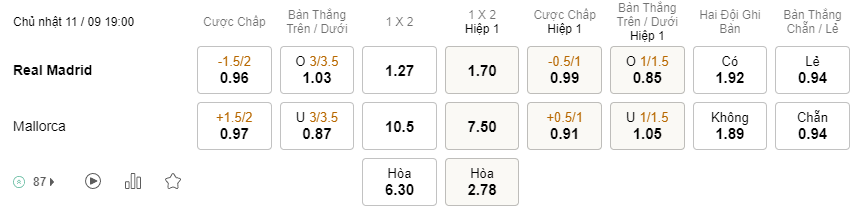 Soi kèo hiệp 1 Real Madrid vs Mallorca: 0.99*0.5/1*0.91
