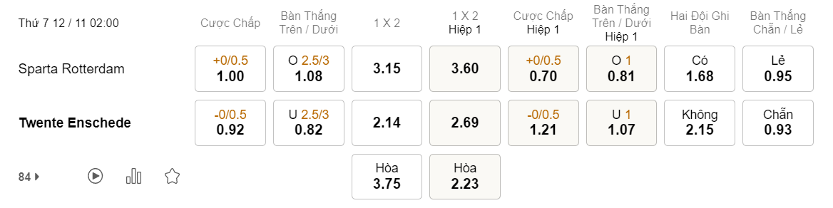 Soi kèo hiệp 1 Rotterdam vs Twente: 0.70*0/0.5*1.21