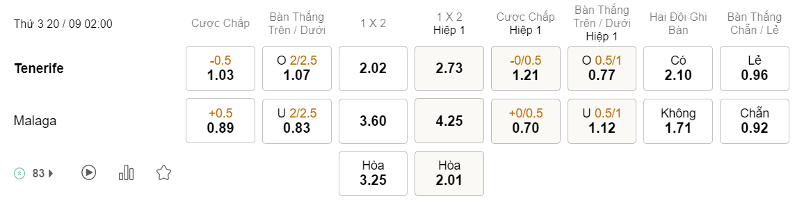 Tỉ lệ kèo Tenerife vs Malaga