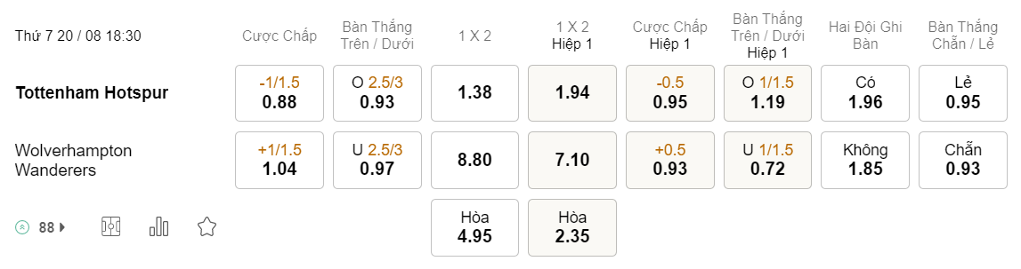 Soi kèo châu Á Tottenham vs Wolves: 0.88*1/1.5*1.04