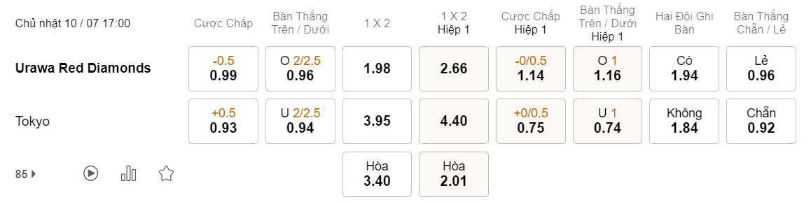 Soi kèo hiệp 1 Urawa Reds vs Tokyo: 1.14*0/0.5*0.75